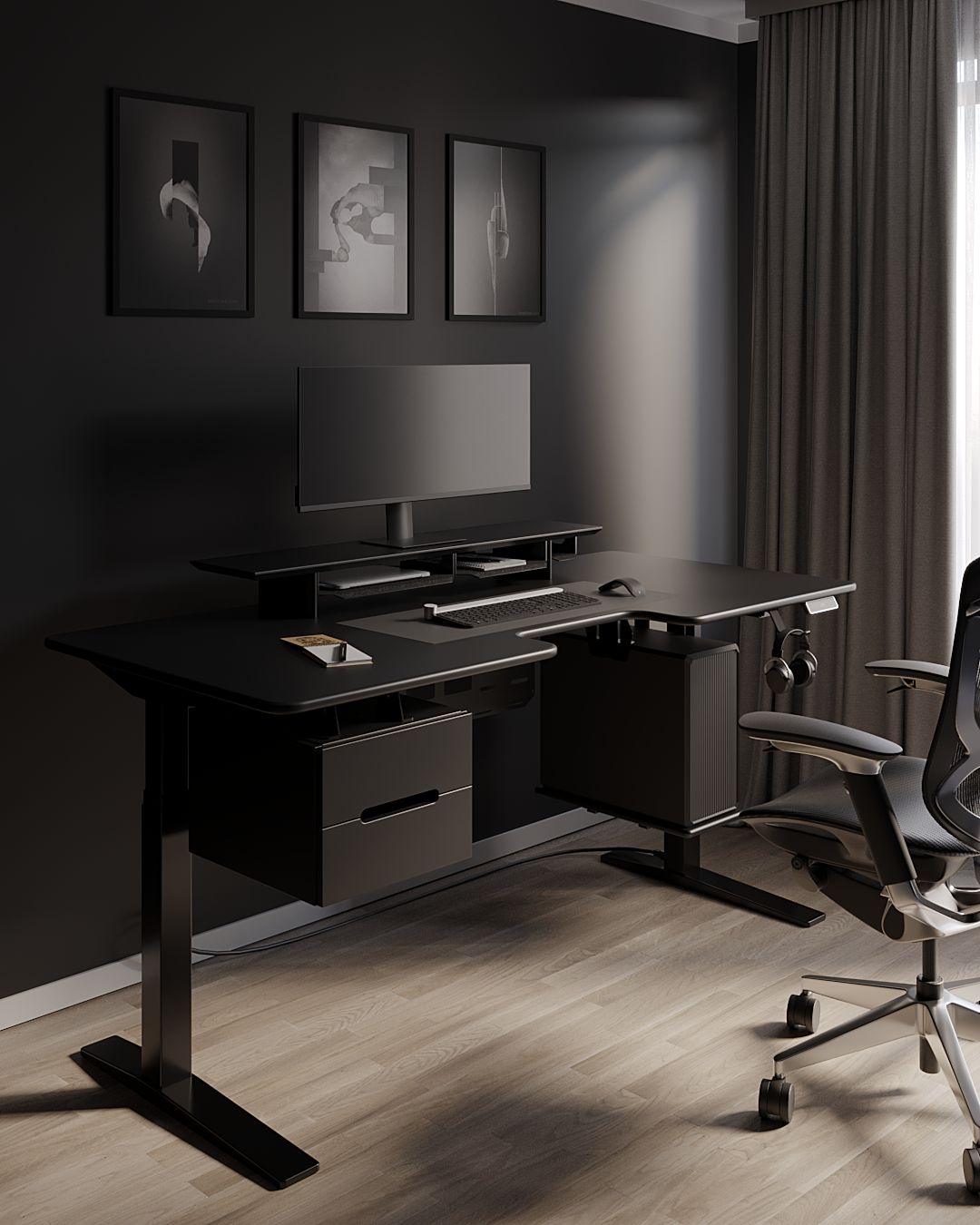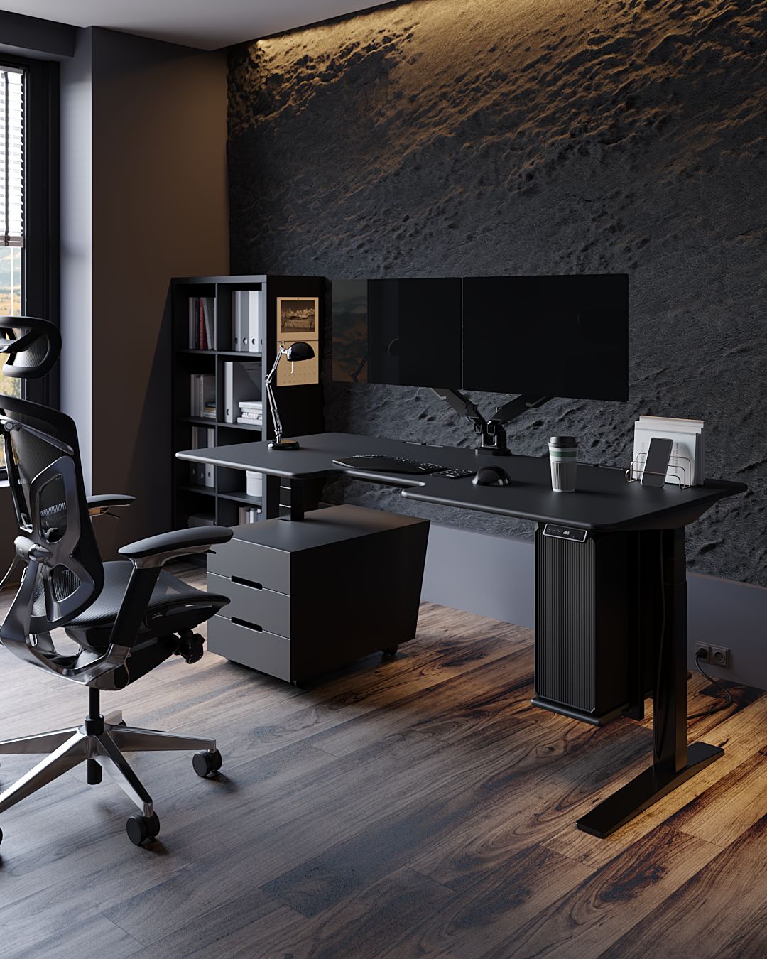Він витримує до 125 кг, працює майже безшумно (<40 дБ) і піднімається зі швидкістю 40 мм/с. Нижнє підключення живлення через опору усуває плутанину з кабелями — простір під столом залишається чистим і безпечним. Сенсорний пульт із пам’яттю на 3 висоти дає змогу швидко переходити між роботою сидячи й стоячи, зменшуючи навантаження на спину та покращуючи концентрацію. Чорний колір — лідер серед ІТ-фахівців, адже він знижує візуальне навантаження, не відбиває світло від моніторів і створює відчуття фокусу та мінімалізму у просторі. Саме тому чорні столи з регулюванням висоти найчастіше вибирають розробники, дизайнери та трейдери. Комплектація включає чорну МДФ-стільницю 180×82 см, кабель-менеджмент, розетковий блок на 6 розеток і опції тумб — підлогову або підвісну. Streamline — це технологічно продуманий простір, який допомагає працювати довше, ефективніше й без болю в спині.
