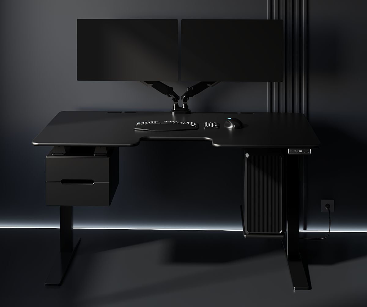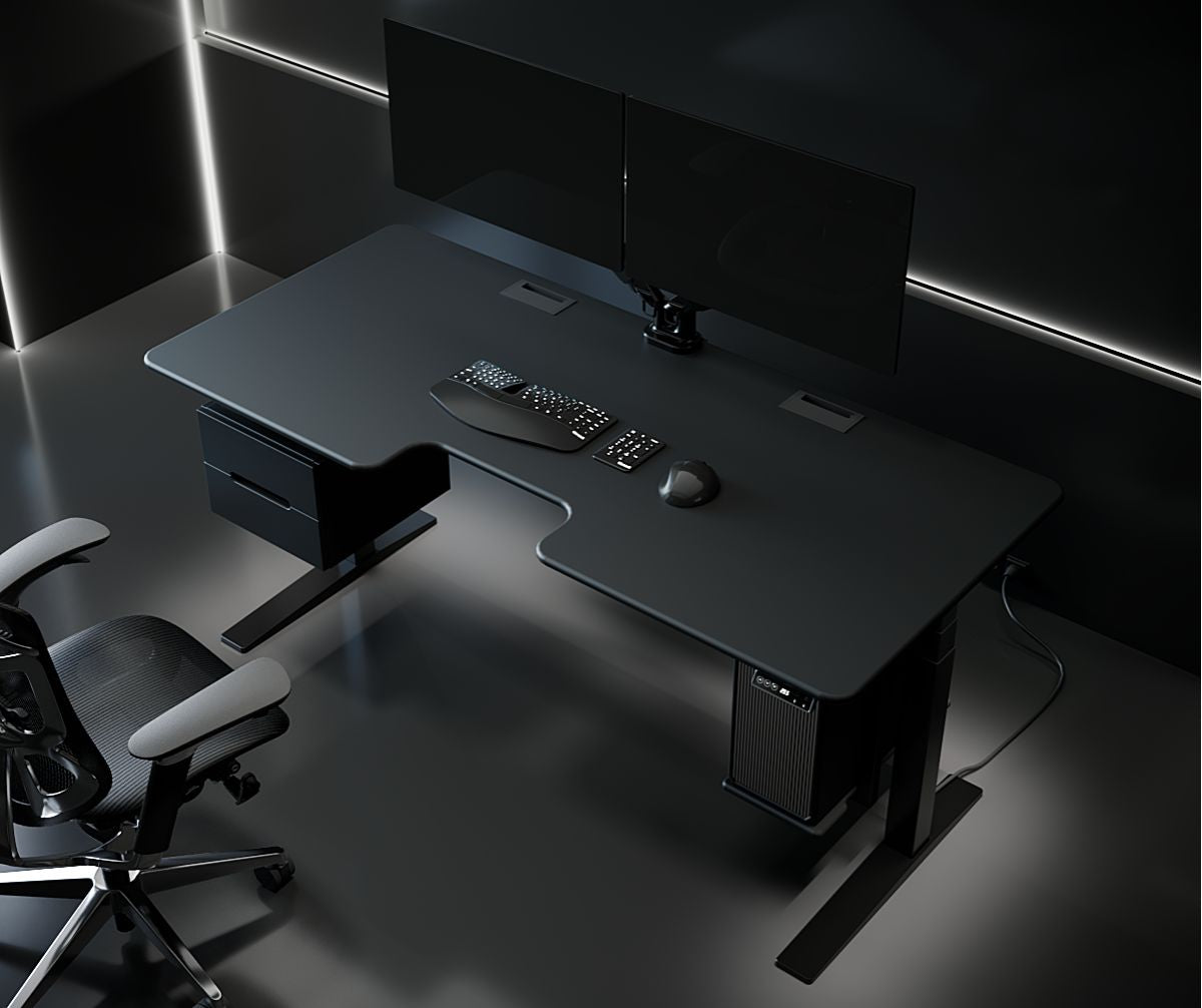 Комплектація включає сенсорний пульт із 3 позиціями пам’яті, антіколізію, дитяче блокування, чорну МДФ-стільницю 180×82 см, кабель менеджмент, 2 прямокутні заглушки під дроти, подовжувач під стільницю на 6 розеткових блоків та полицю під ПК .